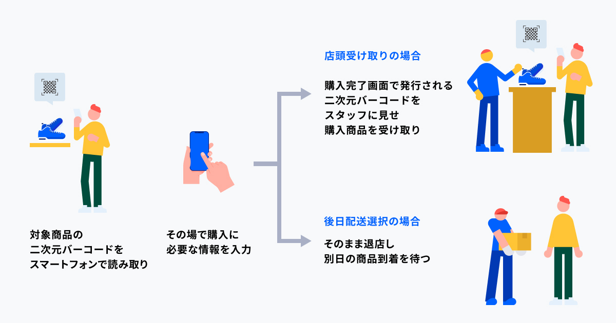 THE [ ] STOREは、SUPER STUDIOと三井不動産がEC/D2Cブランドへ提供するOMOソリューションのひとつです。来店者は自らのスマートフォンを使って二次元バーコードから商品を購入できます。出店するEC/D2Cブランドは、オンラインだけでなく、オフライン(リアル店舗)での購入データもecforceで一元管理できるようになるため分析がしやすく、顧客体験を向上するためのCRM施策などに活用できます。