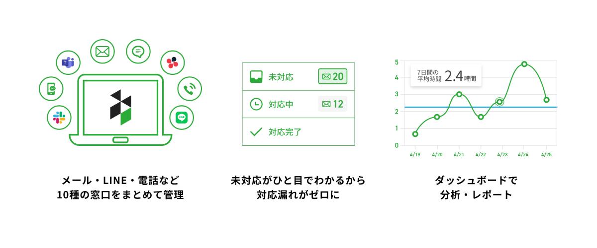 メール、電話、チャット、LINEなど多様化するコミュニケーションサービスを一つの画面に集約し、顧客との接点が増え複雑になった問い合わせを簡単に一元管理できます。さらに、二重返信や対応漏れを防止するステータス管理やWチェックが簡単にできる承認機能など、複数人での問い合わせ対応で生じがちな様々な課題を解決する機能を備えています。