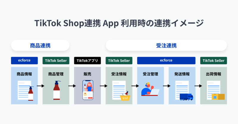 「TikTok Shop連携 App」を利用することで、ecforceに登録された商品情報の連携やTikTok Shopの受注情報の連携、在庫情報の連携ができるようになります。また、TikTok Shopでの販売データをecforce上で一元管理できるようになります。