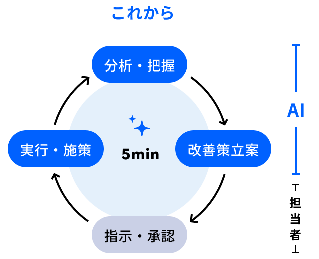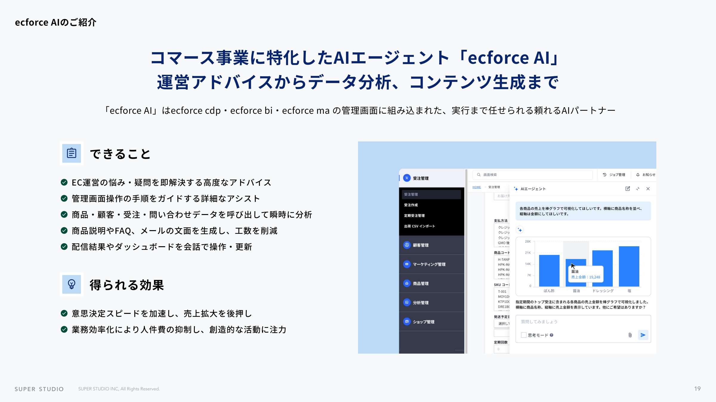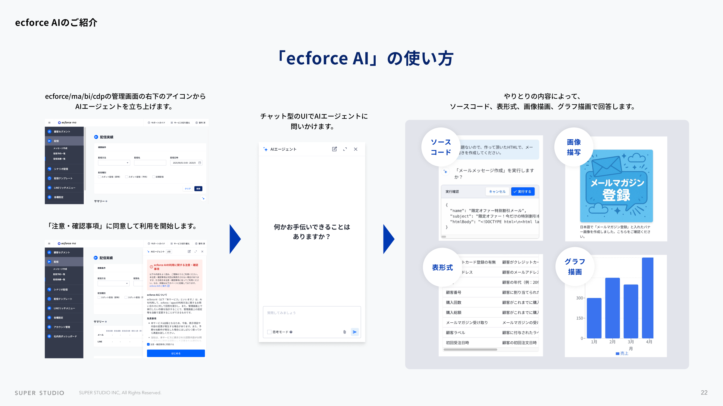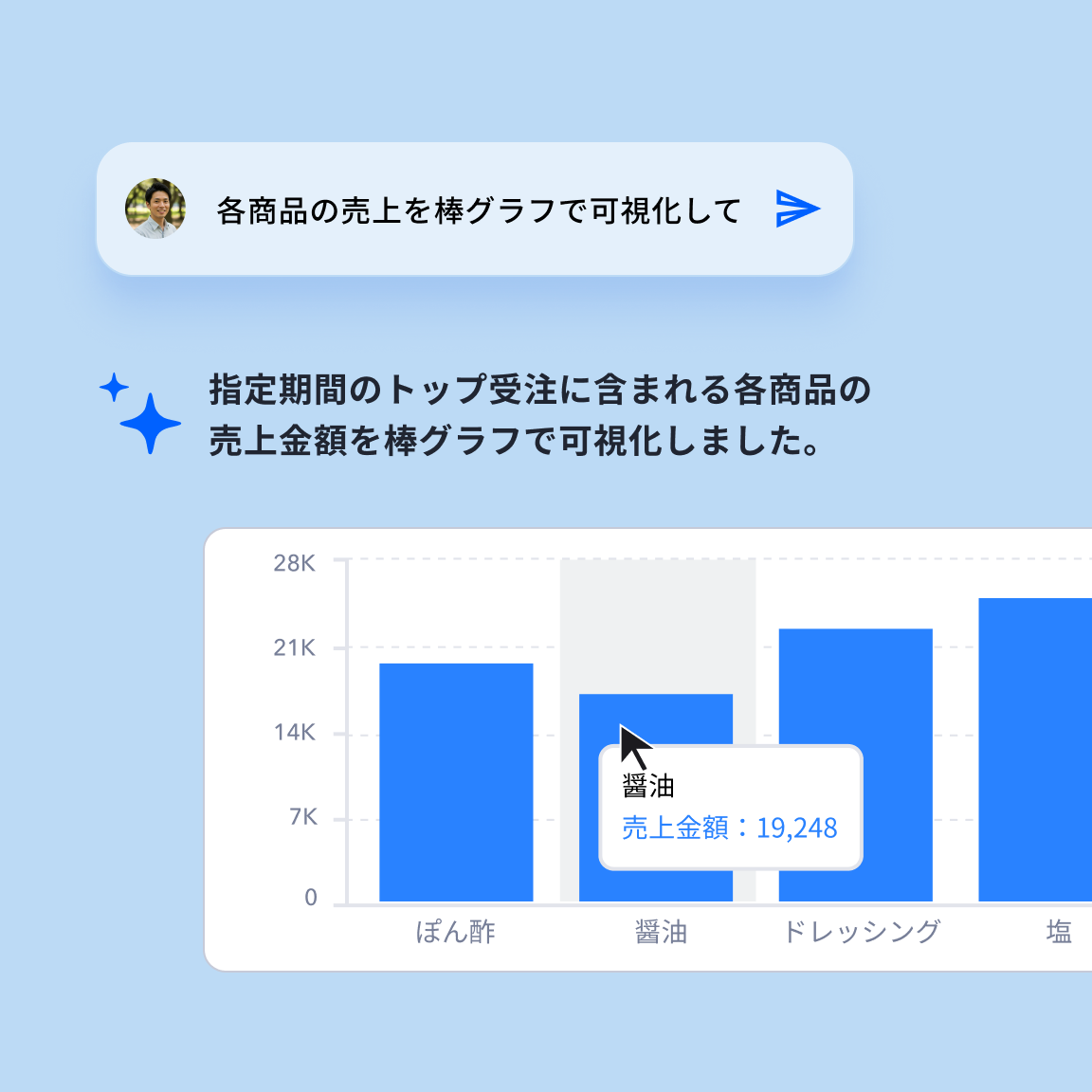 AIが売上・顧客・施策データを横断分析し、分析/グラフ化。