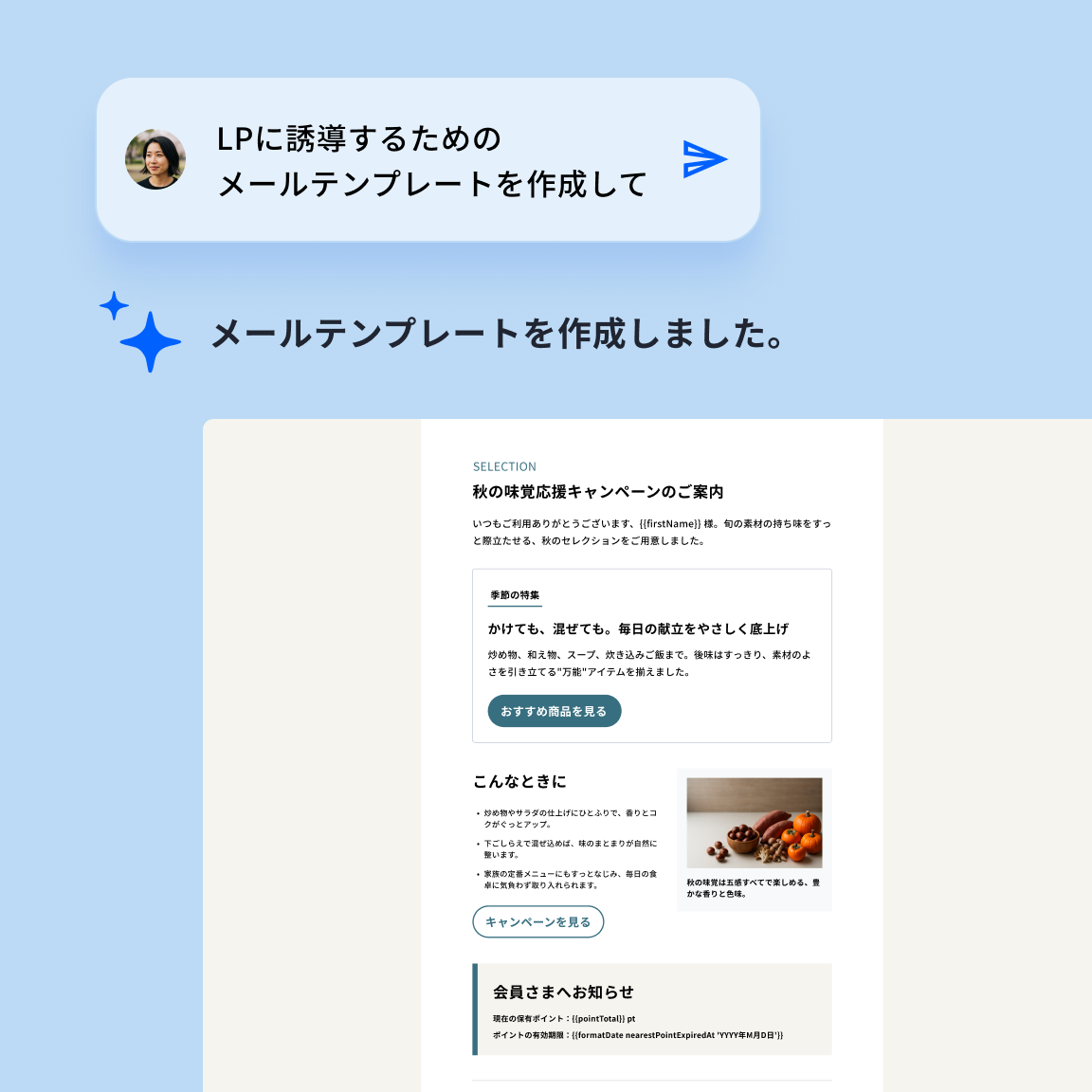 販促LPのURLをチャットに送るだけで、過去配信実績をもとに、効果のあるHTMLメールを自動で作成。