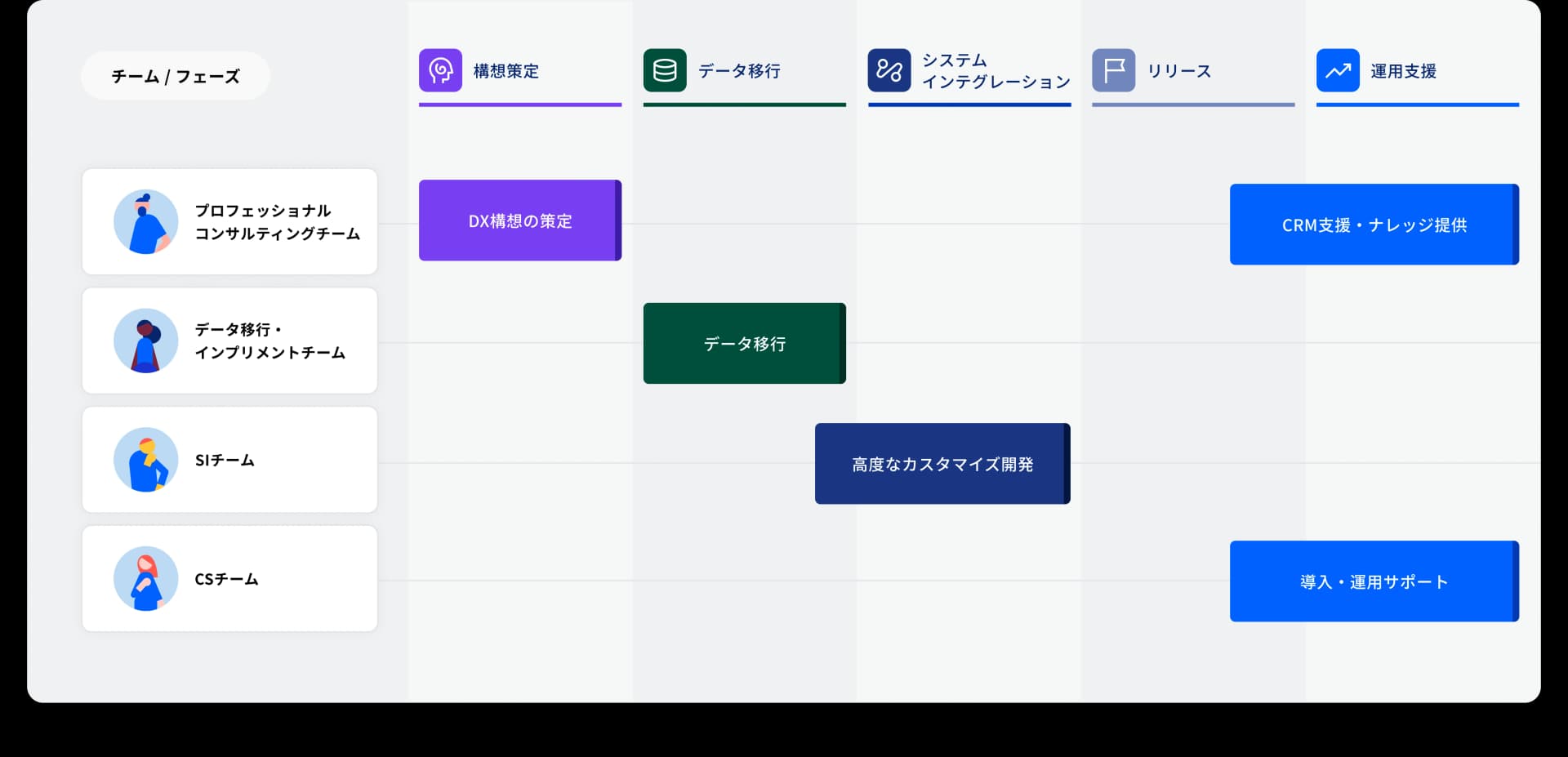 構想策定からリリース後のCRM戦略まで、ワンストップで一気通貫で伴走します。